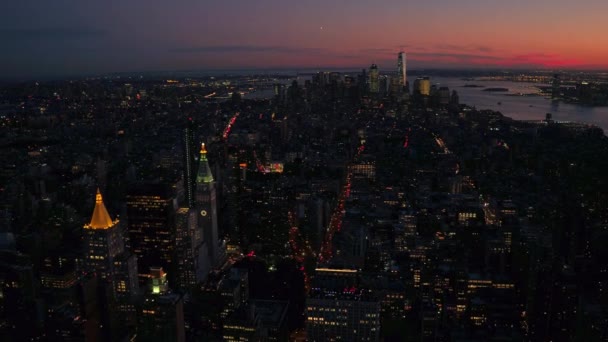 Antenne Grundung Schuss Atemberaubende Aussicht Vom Empire State Building Von New York City Skyline Bei Nacht Manhattan Downtown Geschaftsviertel Und Dichten Verkehr Auf Der Belebten Voll Mit Autos
