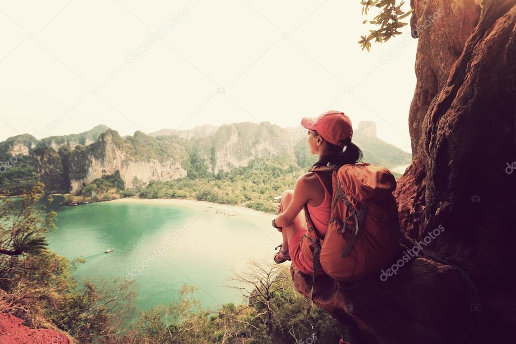 Frau Vor Klippen Sitzen Und Die Aussicht Geniessen