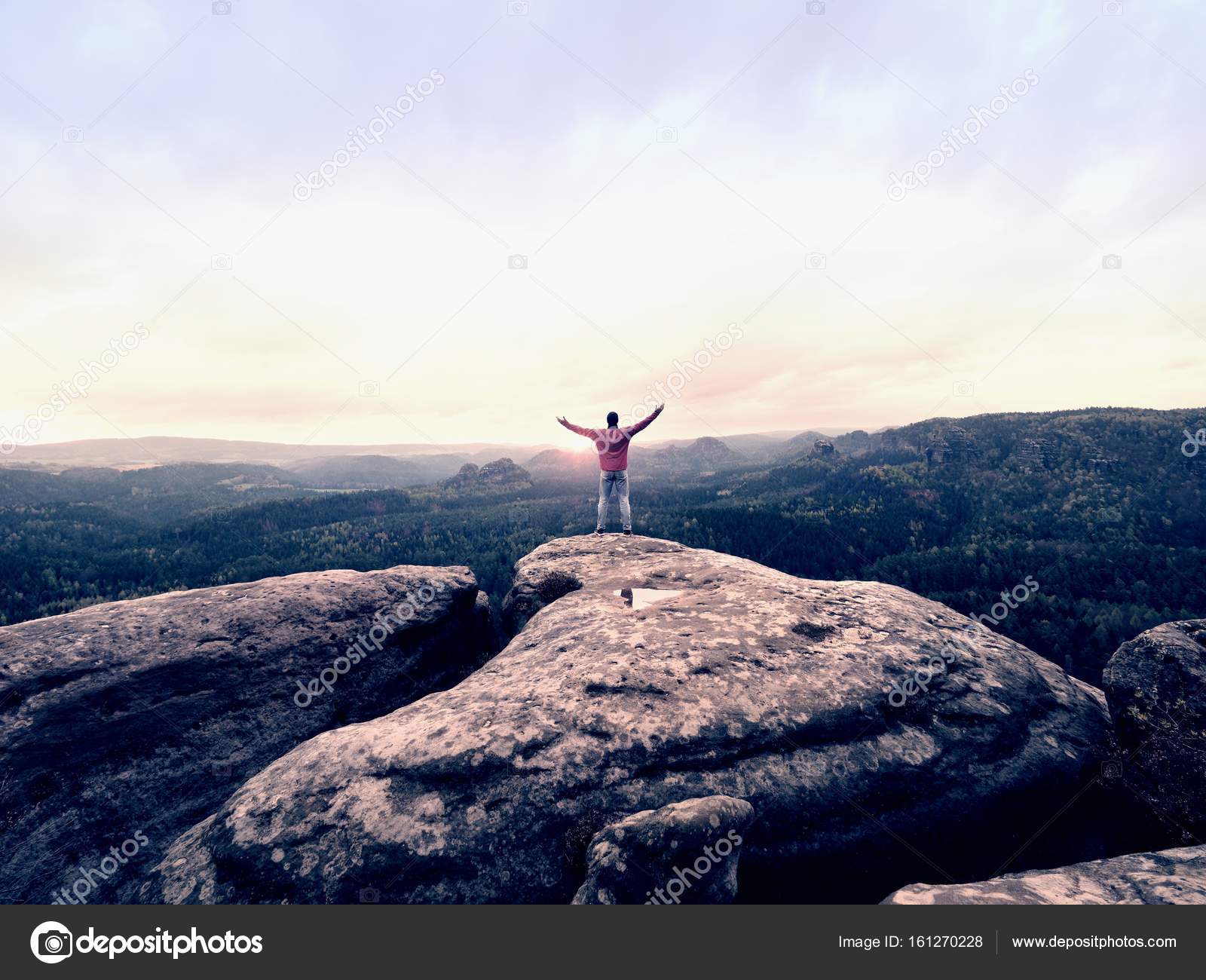 Mann Wanderer Auf Scharfen Felsen Aussicht Geniessen